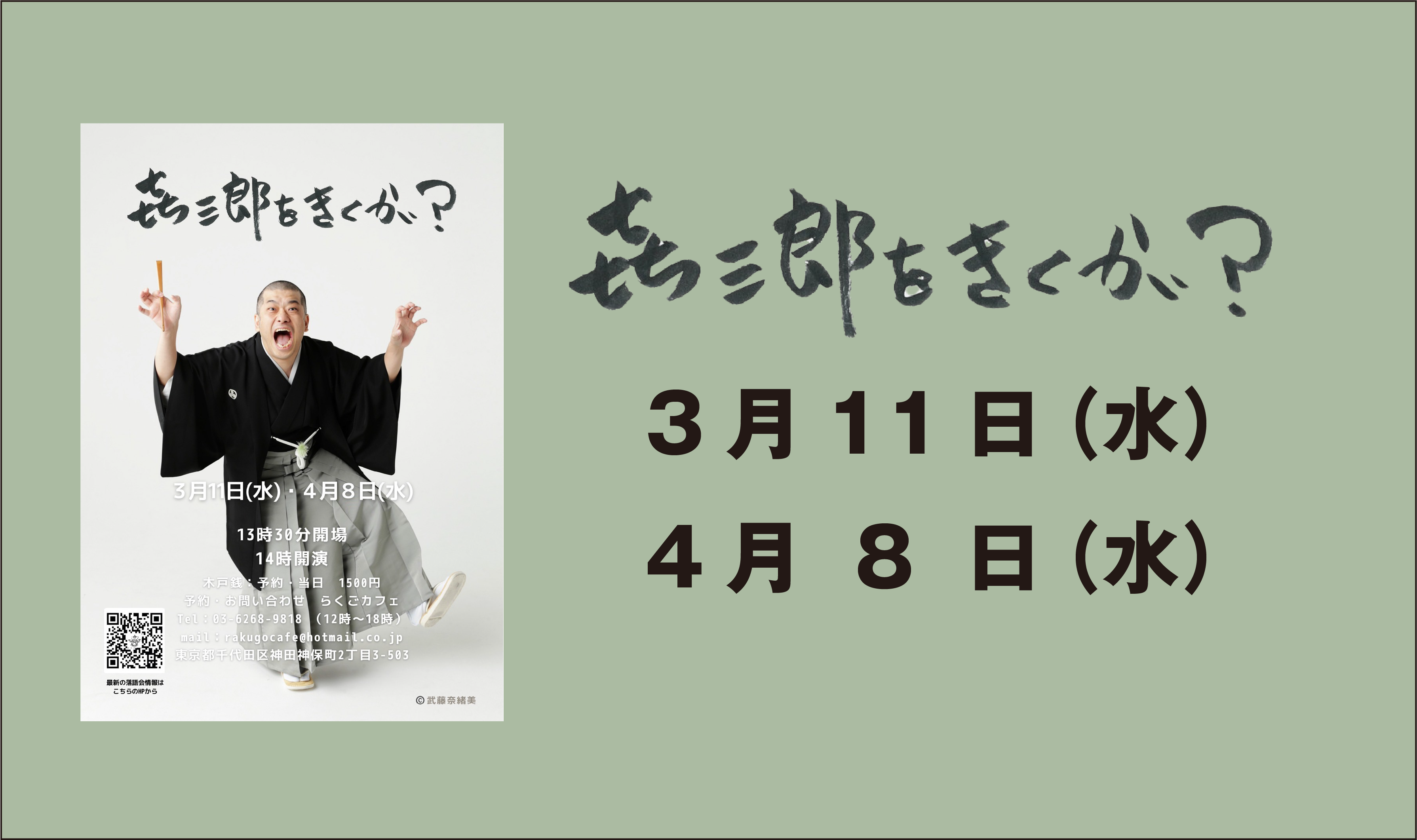 特別なことがなければ月に一度、神保町のらくごカフェで開催している「㐂三郎をきくかい?」。たっぷり聞けて予約・当日1,500円。初めての方も大歓迎です。開催日:03/11(水)|04/08(水)