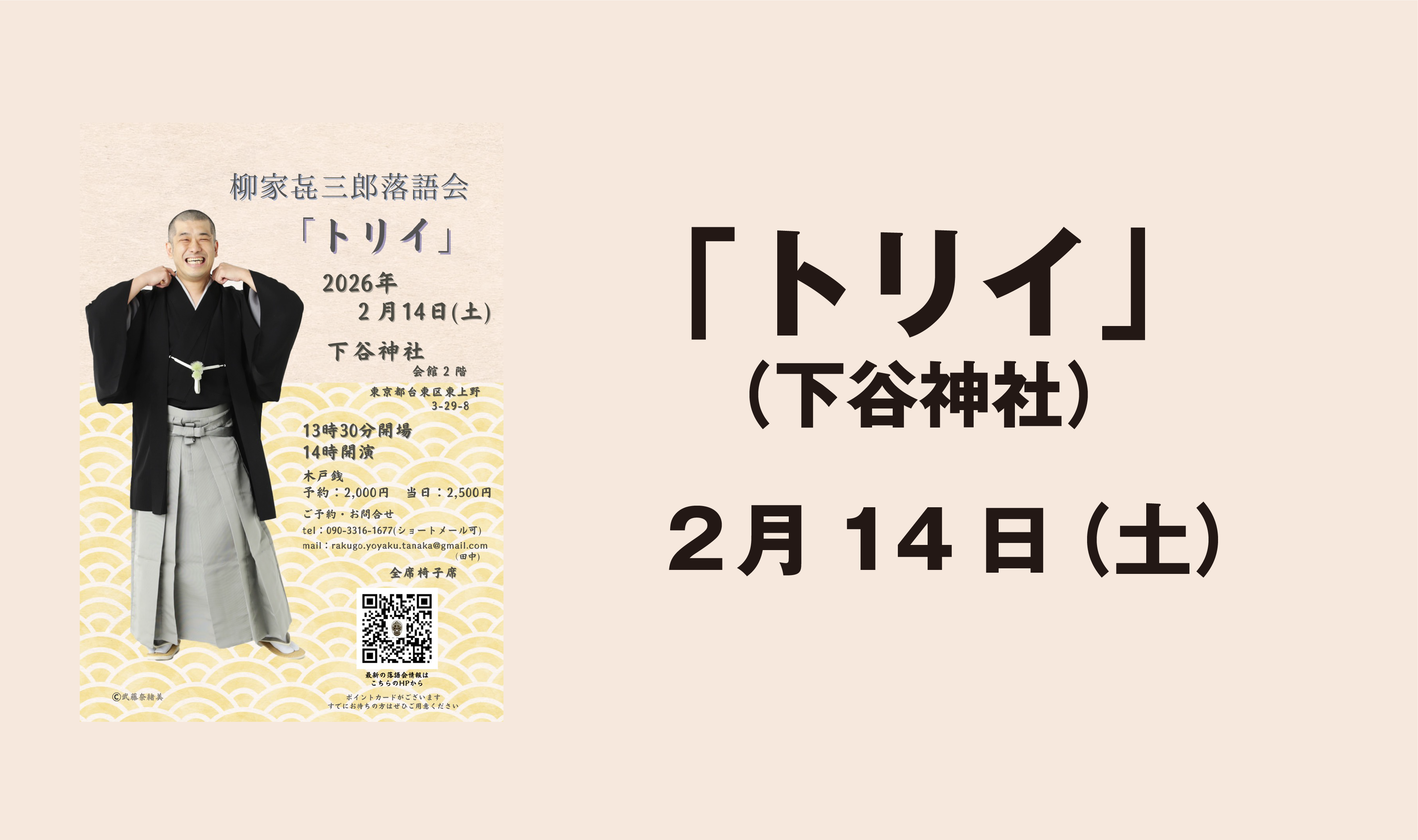 ポイントが貯まる大好評の㐂三郎独演会「トリイ」。境内に「寄席発祥之地」の石碑があり、寄席のはじまりだと言われている由緒ある下谷神社で開催しています。開催日:02/14(土)