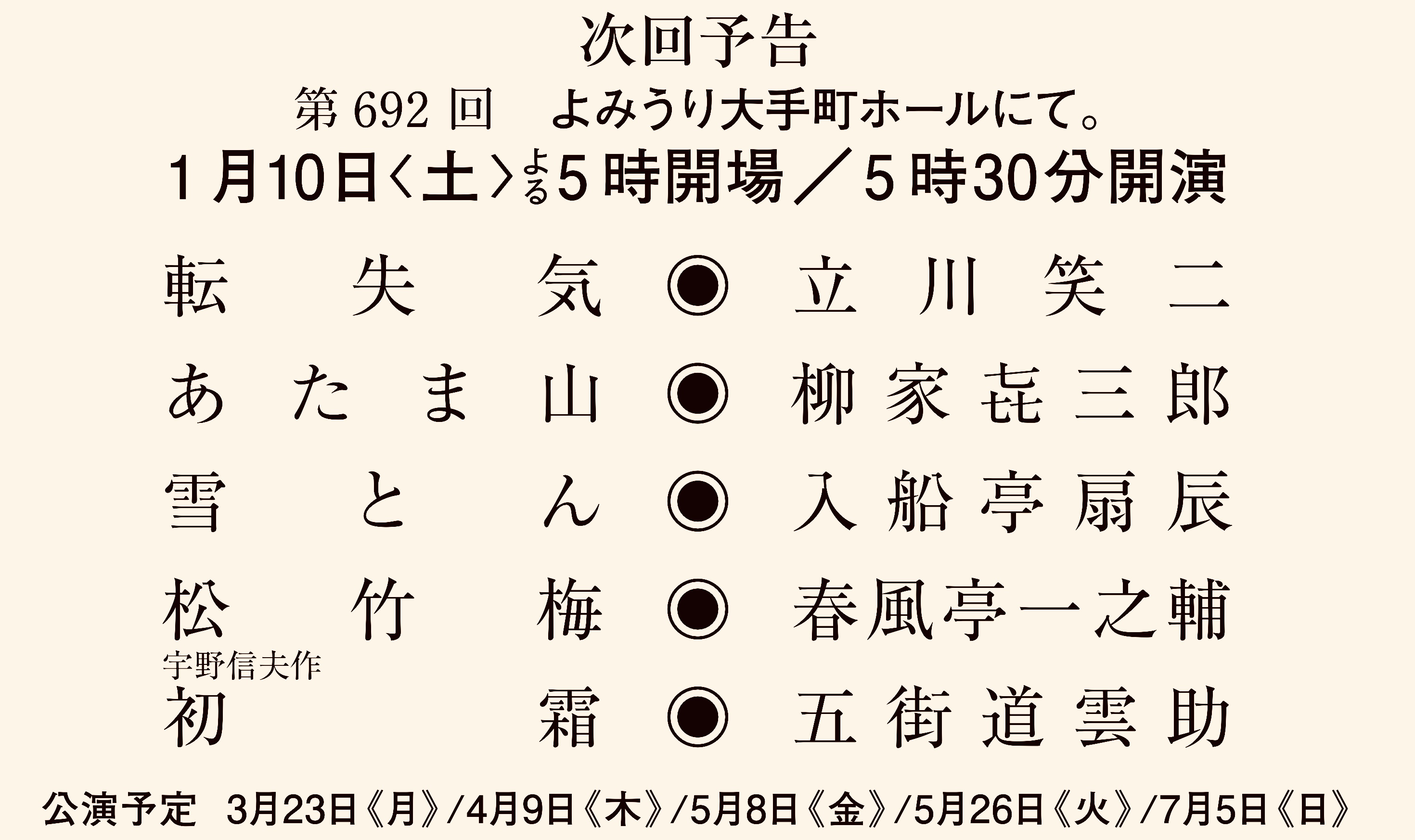 【出演者】立川笑二『転失気』|柳家㐂三郎『あたま山』|入船亭扇辰『雪とん』|春風亭一之輔『松竹梅』|五街道雲助『初霜』
